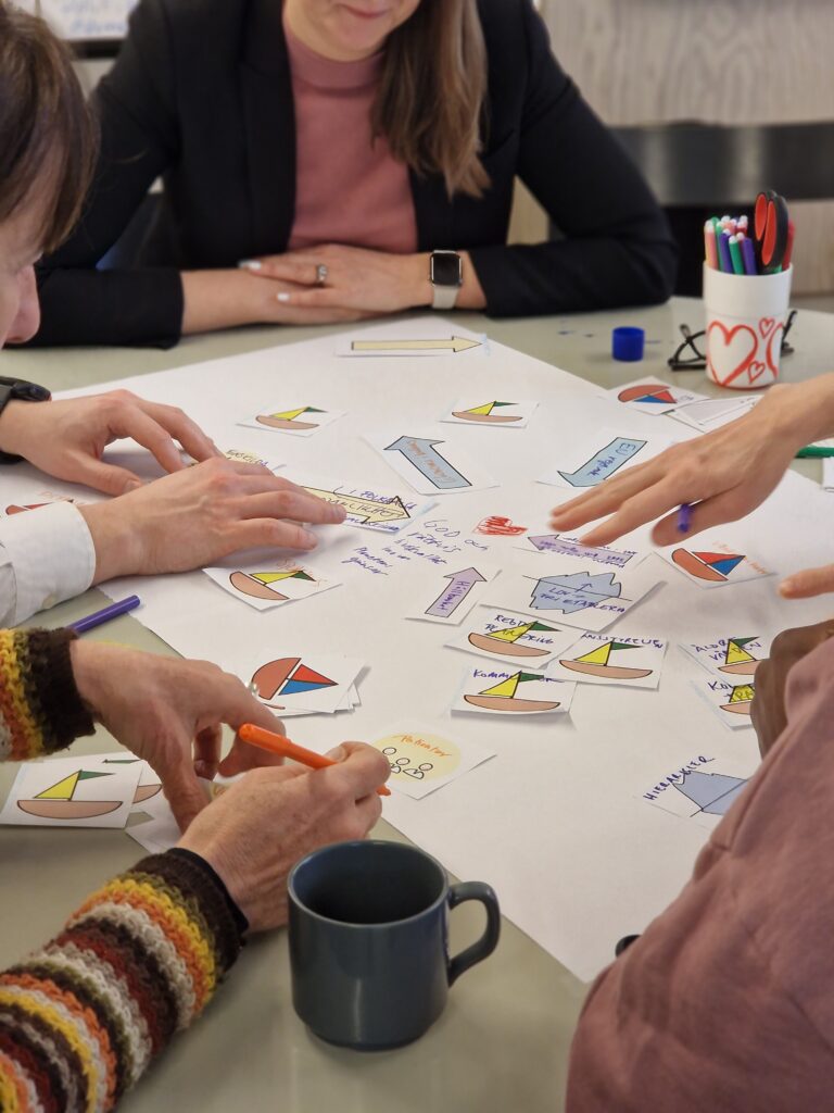 Utifrån liknelsen att ”vi sitter i samma båt” guidades grupperna genom övningar som gruppreflektionen ”segelbåten”, omvärldskartan kring trender och skeenden och en övning i att utveckla spekulativa framtidsscenarier kallad ”fyra stränder”. Baserat på gruppernas mest önskvärda framtidsscenario för sektorn utvecklade deltagarna framtidsprototyper av möjliga framtida tjänster, produkter och verksamheter för att närma sig samsyn och framsyn till grund för vidare samverkan.