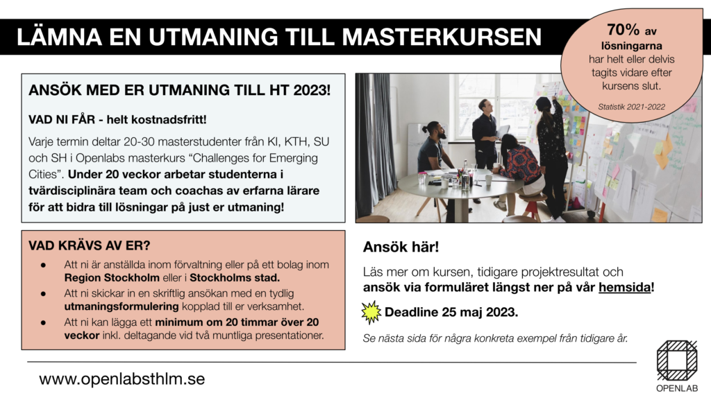 Nu kan ni som arbetar inom Stockholms stad och Region Stockholm lämna in en utmaning till Openlabs masterkurs, med chans att tilldelas ett kvalificerat studentteam som arbetar i 20 veckor för att bidra med lösningar på just er utmaning! Det är helt kostnadsfritt. Ert åtagande är att avsätta 20 timmar eller mer under terminen för projektet. Under de 4 kurser som gick 2021-2022 togs 70 % av lösningarna vidare efter kursens slut. Läs mer och ansök via vårt formulär
