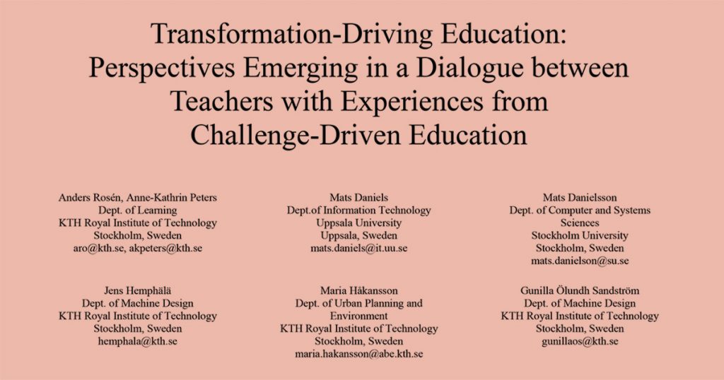 Artiklen ’Transformation-Driving Education: Perspectives Emerging in a Dialogue between Teachers with Experiences from Challenge-Driven Education’ har skrivits av en grupp lärare som arbetar med utmaningsdrivna utbildningsformat, däribland Jens Hemphälä (KTH) och Mats Danielson (SU) som undervisar på Openlabs masterkurs, och en av Openlabs arbetsgruppmedlemmar Anders Rosén (KTH).