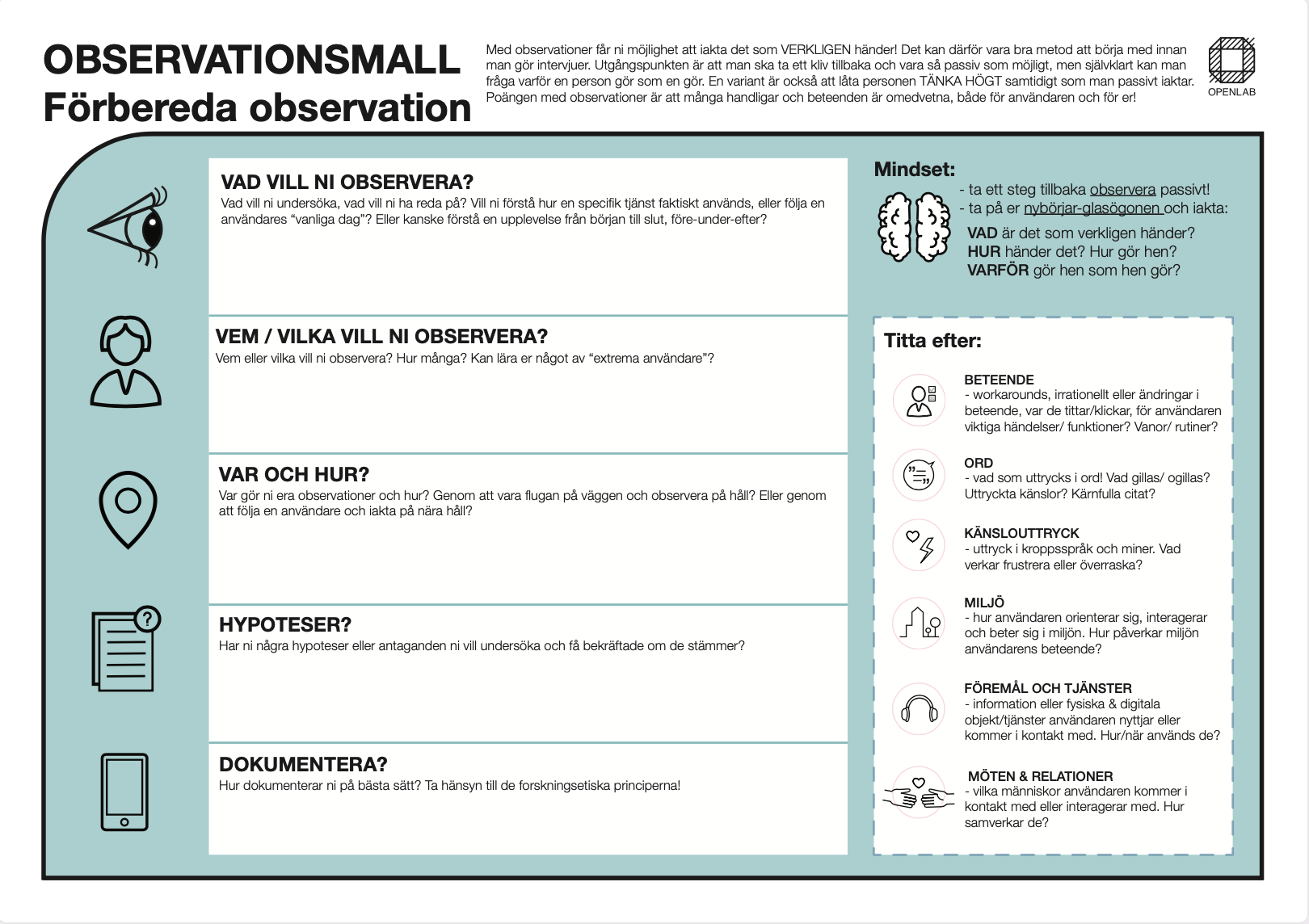 - Ladda ner/skriv ut mallarna ”Observationsmall och Observationer”.